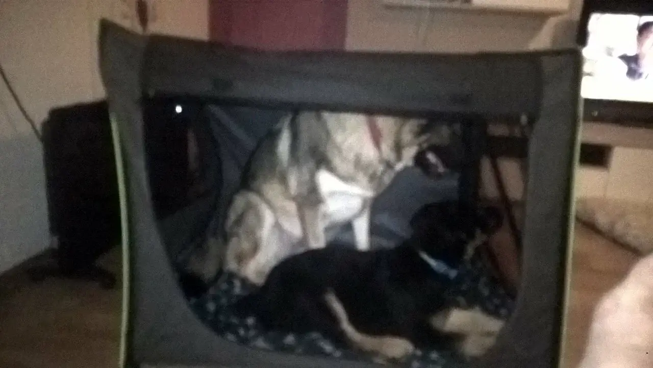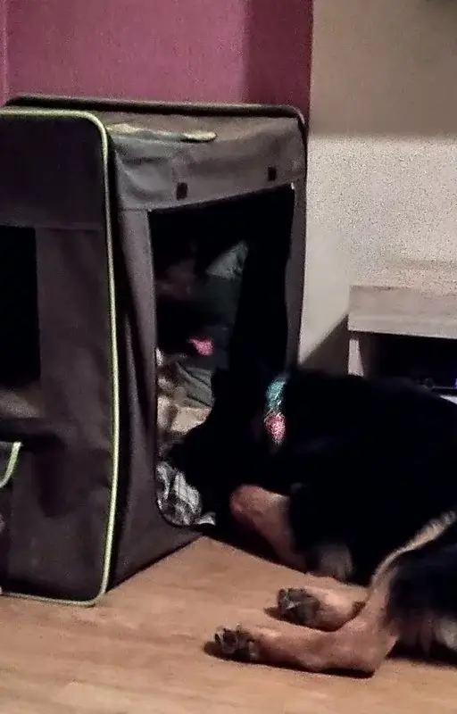 Später haben wir die Stoffbox gekauft und im Wohnzimmer aufgebaut. Und noch während des aufbaus lag Dina (sie liebt alles kuschelige) schon drin und er auch :D