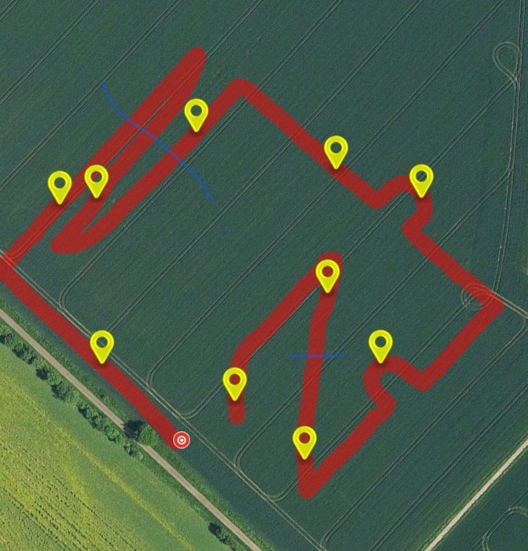 Die Fährte war super, ich bin mega zufrieden. Auf dem Bild fehlt der erste Teil, da hatte ich schon mal ein kleines Winkelviereck gelegt, da war sie beim 3 Winkel etwas drüber und bei dem, wo es dann rechts hoch geht, auch. Ansonsten absolut super. Bei einem spitzen Winkel wollte sie heute tatsächlich abkürzen, was ich aber korrigiert habe.