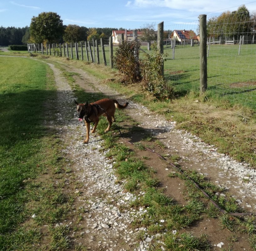 Jetzt darf er täglich mindestens ein mal richtig rennen auf dem freien Feld, der Rückruf klappt gut, mit der Hochfrequenzpfeife auch aus größerer Entfernung. Er darf wieder auch am Rad mitlaufen, Bälle holen usw. alles, was während des Hundeschulentrainings verboten war. Dann ist er nämlich relativ entspannt für den restlichen Tag. Und er ist jetzt recht leicht zu händeln.
