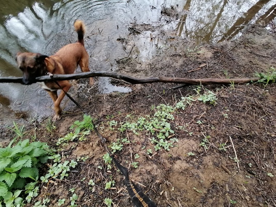 Nachdem wir Bo bei seinen manischen Flussaufräumarbeiten beobachtet haben, habe ich den Eindruck, dass er eigentlich dort dasselbe macht, wie anfänglich alleine zu Hause: Er sammelt Dinge und bringt sie an eine Stelle. Er beginnt mit dem größten Ast (also meistens eher ein Baumstamm), den er aus dem Fluss zerrt und ans Ufer bringt, dann holt er noch mehr Holz aus dem Fluss und legt es dazu.