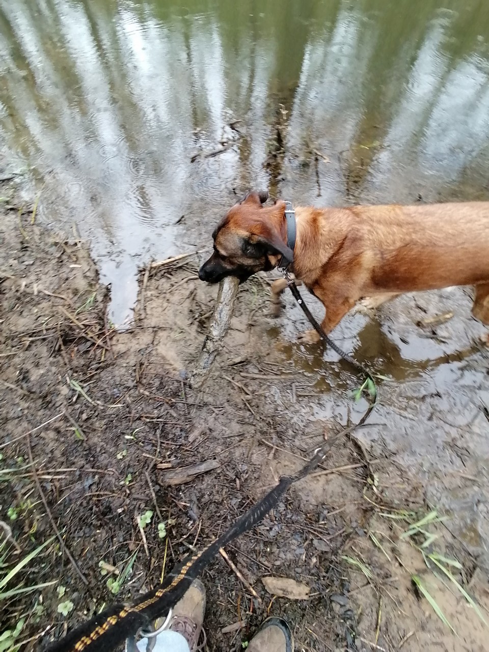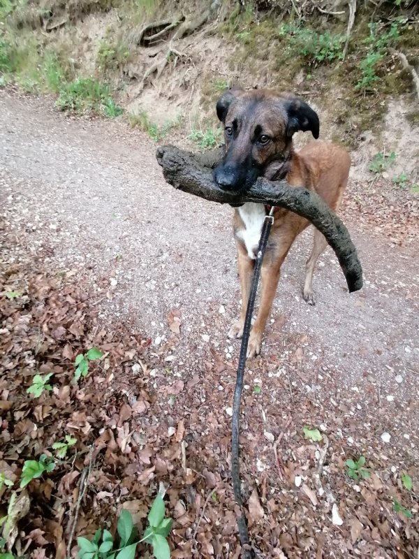 Er scheint dann auf seinen Scheiterhaufen sehr stolz zu sein. Wenn wir dann weitergehen, sucht er sich ein Stück davon aus, dass er mitnimmt und bis nach Hause trägt. Und er lässt das dann unterwegs auch nicht mehr los bis wir zu Hause sind, auch nicht zum Pinkeln bzw. Markieren. Das konnte ich mit der Kamera leider noch nicht einfangen, aber wenn, wird das ein Lieblingsbild des Tages. Er sieht dann mit dem Holzteil im Maul und dem gehobenen Bein aus wie ein Yogi, der gerade seine Mitte findet.:S