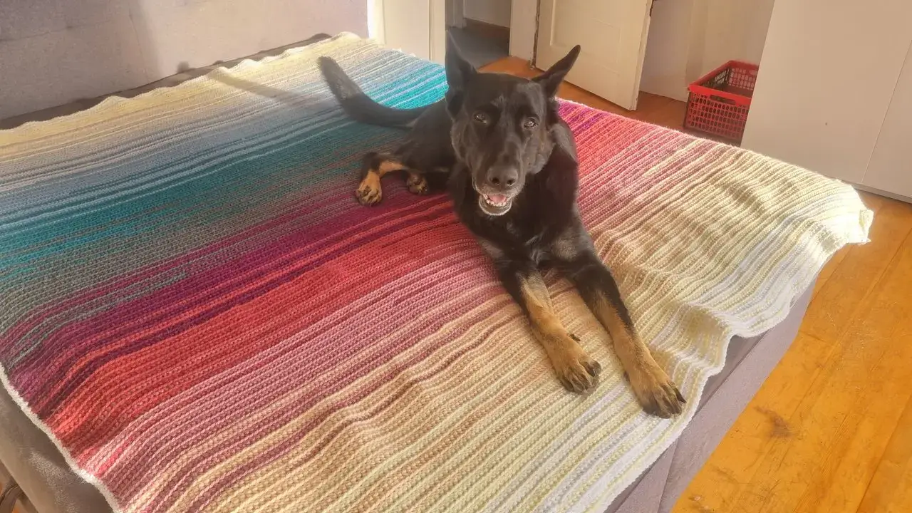 Ich habe die Streifen oben und unten mit weiß abgeschlossen, und dann dachte ich mir "häkel noch nen' weißen Rand drumrum". Der hat die etwas ungeraden Kanten mega gut kaschiert.
