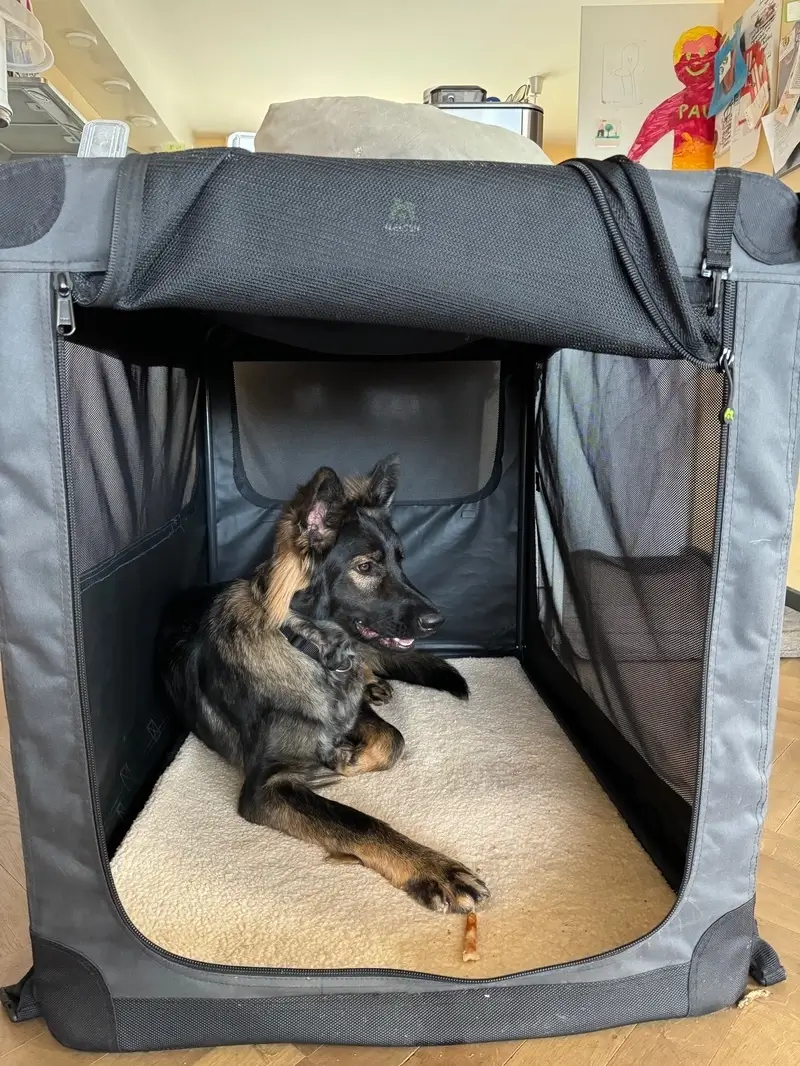Aber dieses konkrete Boxentraining mache ich im Video mit Alma zum ersten Mal. Alma hatte bisher nur ein "ab in die Box" Kommando und wenn ich die Tür aufgemacht habe, durfte sie raus, ohne Kommando. Aussser im Auto, da kann sie direkt aus der Box, muss aber dann vor dem Aussteigen abwarten und Sitz machen. Deshalb kam mir die Übung jetzt gerade recht.