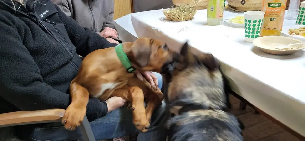 Wir hatten heute Osterfest im Stall. Einfach beruhigend, wenn man weiß, dass der Junghund alle begrüßt, keinen schnappt und auch den Ridgebackjunior der Hundetrainerin im Stall nicht auffrisst..