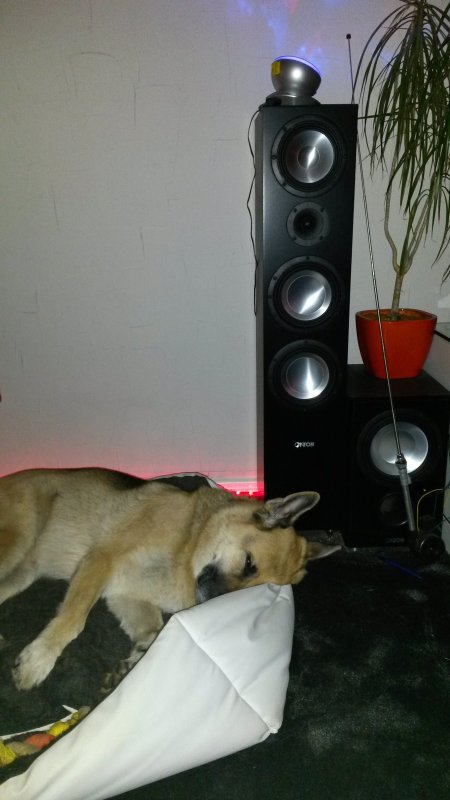 also meinen stinkern war musik seit jeher immer egal. Aber rocky schießt den vogel ab. Das ist der schlafplatz, den er sich selbst gewählt hat, als er hier eingezogen ist. Und die mukke hier ist nicht grad leise. Es läuft alles. Von deichkind über teckno über onkelz und skank ananzi. Der hund macht nur das: