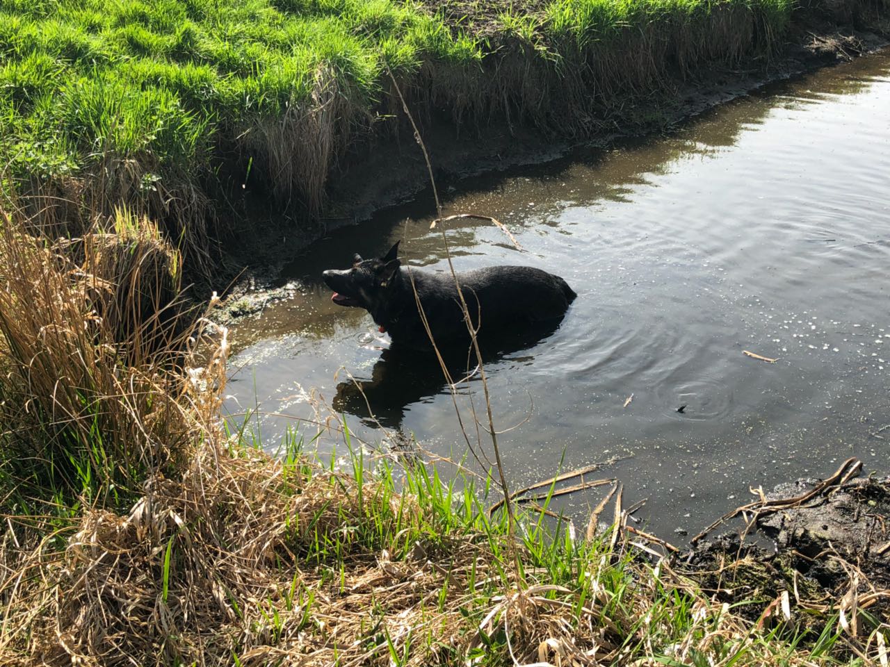 Harras ist aber erst einmal ans seichte Ufer gerannt und hat sich ins Wasser gelegt.